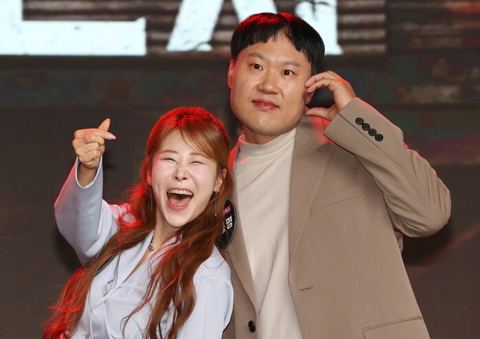 South Korean comedians Park Sae-mi (L) and Kim Yong-myung, who star in "Comedy Revenge," a comedy show by Netflix, pose for a photo during a publicity event in Seoul on Oct. 14, 2024. The reality show will be released worldwide on Oct. 15. (Yonhap)