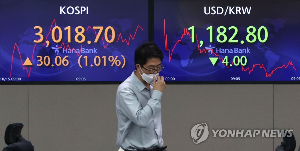 | ▲ A signboard at a dealing room of Hana Bank in Seoul shows that the KOSPI benchmark stock index started higher on Oct. 15, 2021. (Yonhap) |