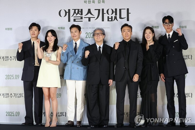 | ▲ 영화 '어쩔수가없다' 제작보고회 (서울=연합뉴스) 강민지 기자 = 19일 서울 용산구 CGV 용산아이파크몰에서 열린 영화 '어쩔수가없다' 제작보고회에서 감독과 배우들이 포즈를 취하고 있다. 왼쪽부터 박희순, 손예진, 이병헌, 박찬욱 감독, 이성민, 염혜란, 차승원. 2025.8.19 mjkang@yna.co.kr |