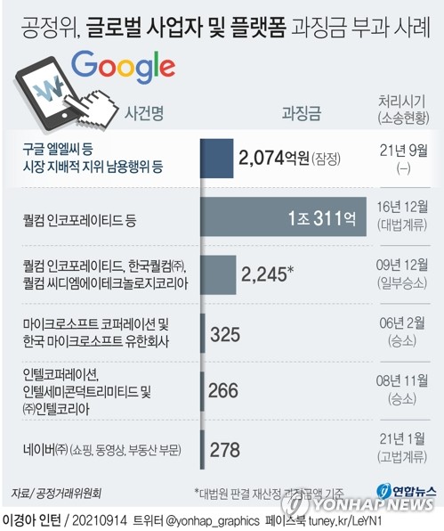 구글 2천47억원 과징금, '퀄컴 1조원' 이후 최대