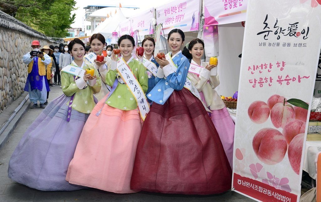 (남원=연합뉴스) 전북 남원시 홍보대사로 위촉된 전국춘향선발대회 입상자들이 6일 춘향제 행사장에서 남원 농특산물을 홍보하고 있다.