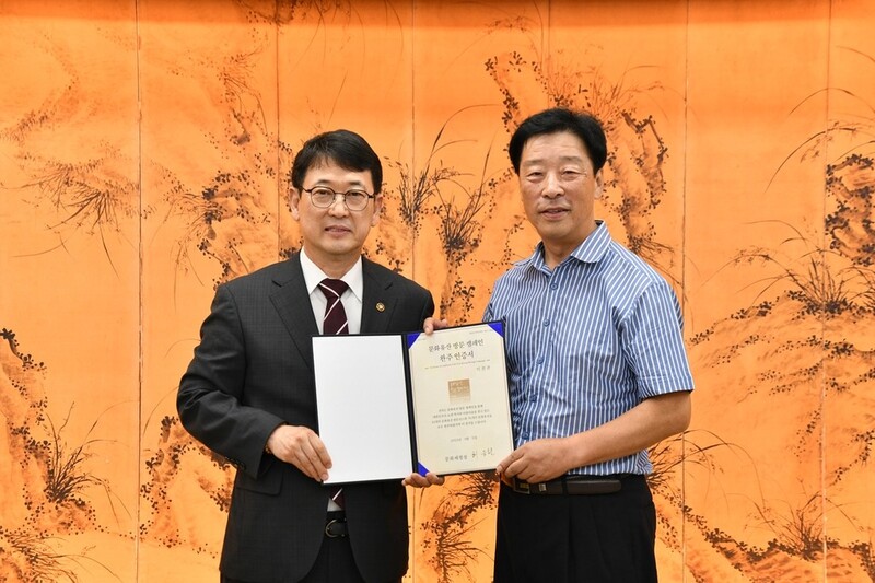 | ▲ 문화유산 방문코스 완주자 인증서 수여식 모습 왼쪽부터 최응천 문화재청장, 이천관 씨 [문화재청 제공. 재판매 및 DB 금지] |