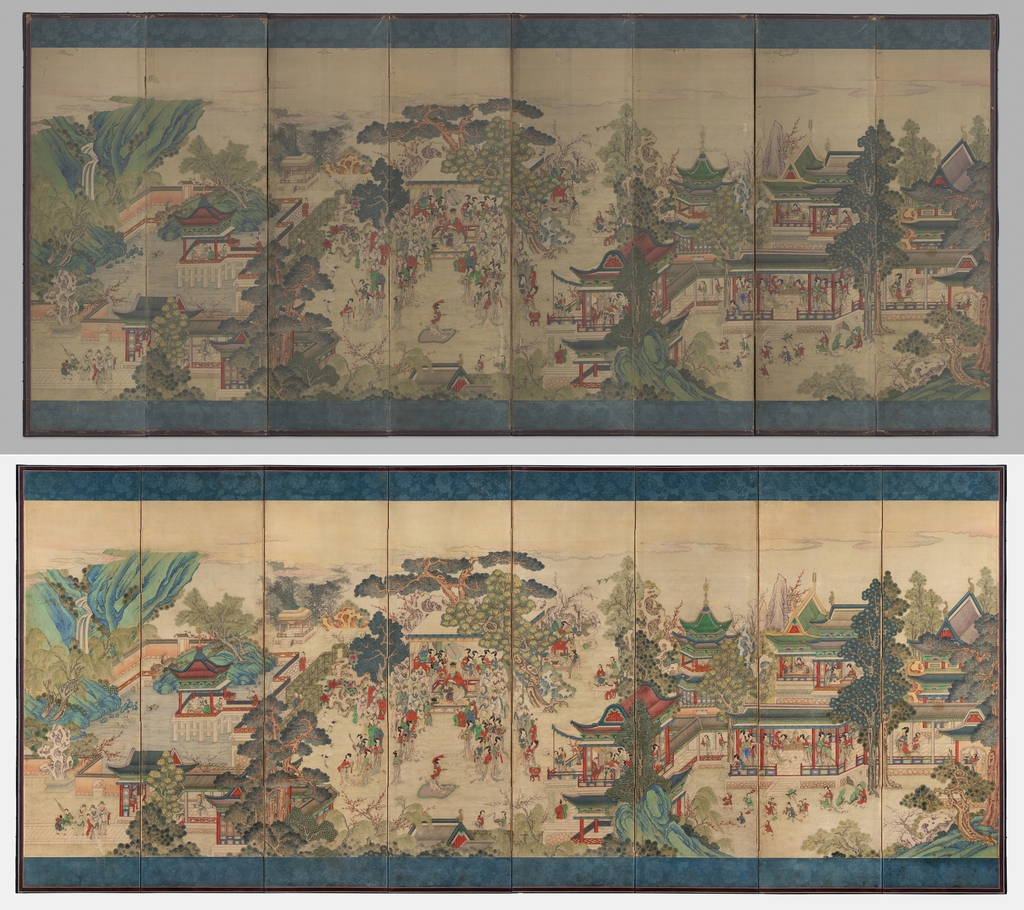 | ▲ 시카고미술관 '곽분양행락도' 보존처리 전(위쪽)과 후 모습 [국외소재문화재재단 제공. 재판매 및 DB 금지] |