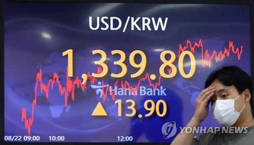 SEOUL, Aug. 22 (Yonhap) -- The South Korean currency on Monday fell to the 1,330 won level against the U.S. dollar for the first time in more than 13 years amid prospects that the Federal Reserve will maintain its aggressive rate hike policy.