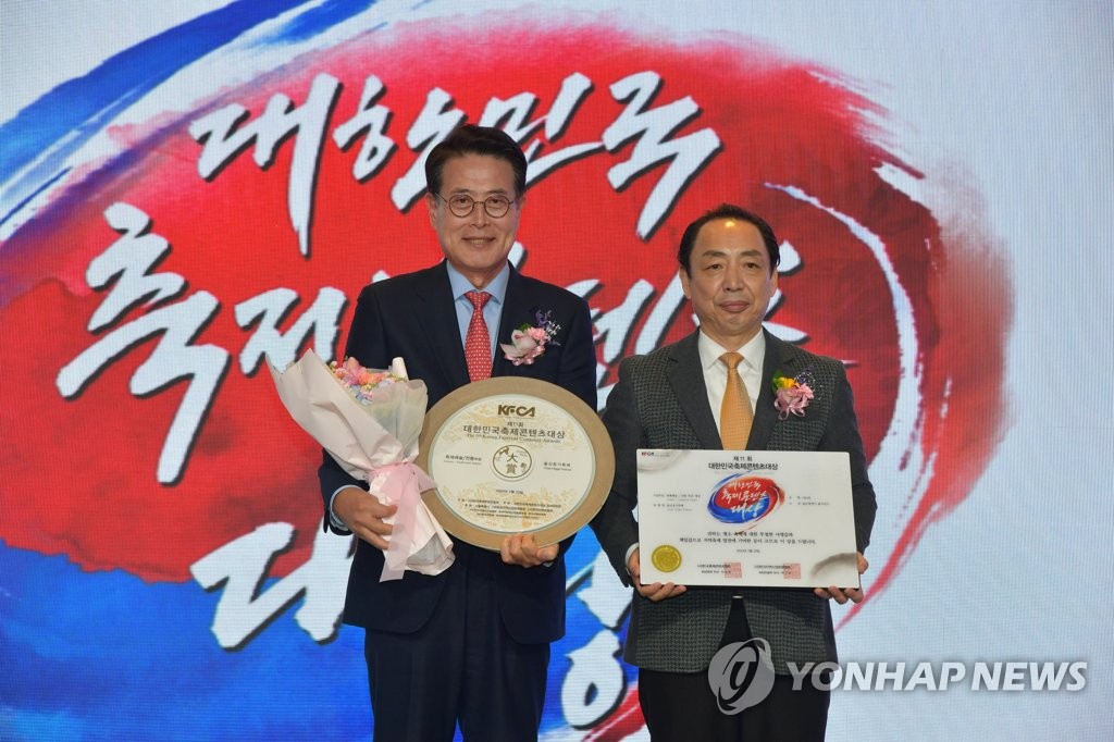 | ▲ 울산옹기축제, 제11회 대한민국 축제콘텐츠 대상 받아 (울산=연합뉴스) 울산시 울주군 대표 축제인 '울산옹기축제'가 23일 한국축제콘텐츠협회로부터 축제예술·전통 부문 2023년 제11회 대한민국 축제콘텐츠 대상을 받았다. 이순걸 울주군수(왼쪽)가 이날 서울 더케이호텔 컨벤션센터에서 열린 시상식에 참석해 대상을 수상한 뒤 차정현 협회장과 기념촬영을 하고 있다. 2023.2.23 [울주군 제공.재판매 및 DB 금지] leeyoo@yna.co.kr |