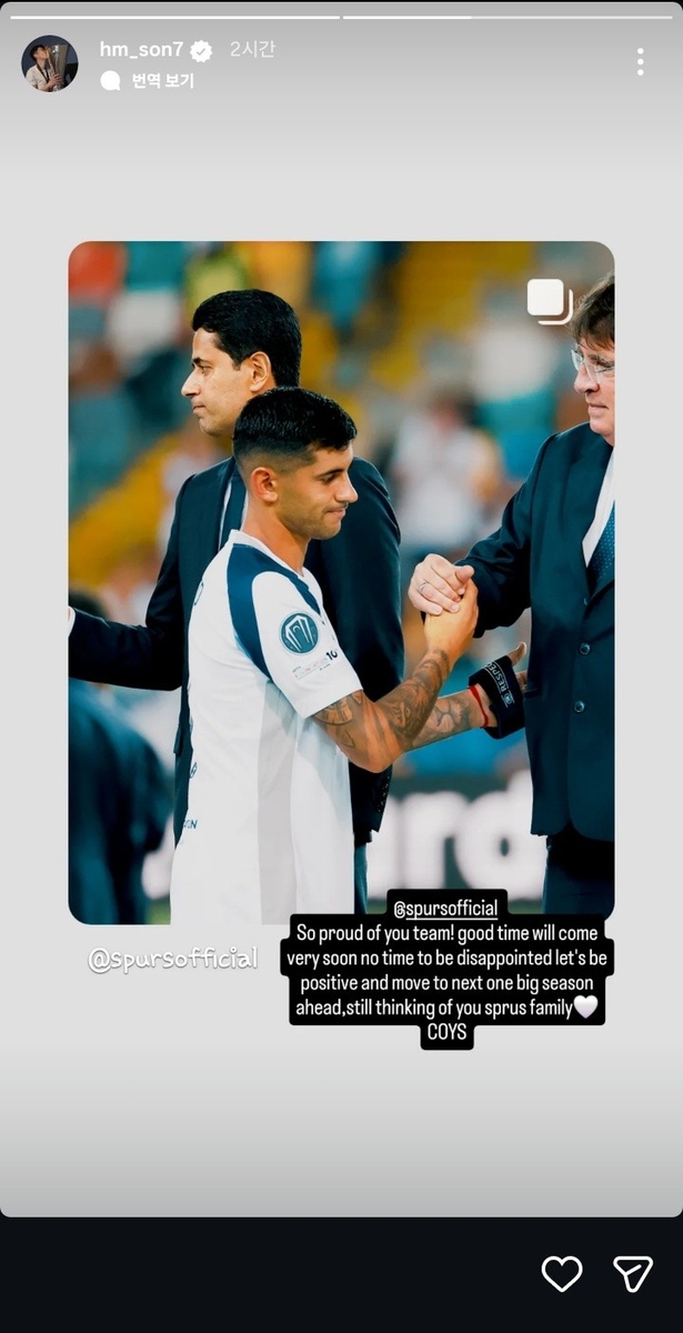 손흥민은 14일 자기 소셜미디어(SNS)에 "너희가 자랑스러워. 곧 좋은 시간이 찾아올 거야"라며 "실망할 시간은 없어. 긍정적으로 생각하고 이젠 또 다른 큰 시즌을 향해 나아가자"고 말했다.