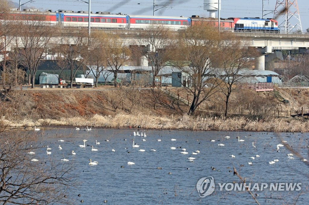 | ▲ 기찻길 옆 안심습지 (대구=연합뉴스) 손대성 기자 = 12일 대구시 동구 금호강 안심습지에서 천연기념물인 큰고니들이 앉아 있는 가운데 바로 옆으로 기차가 지나가고 있다. 2020.12.12 sds123@yna.co.kr |