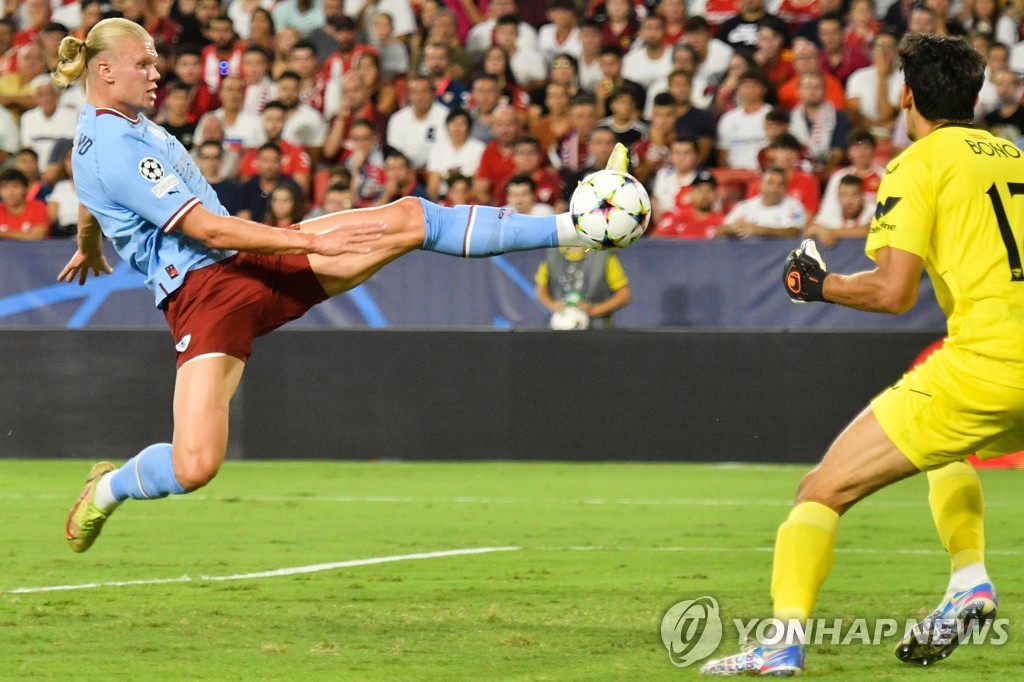 홀란은 7일(한국시간) 스페인 라몬 산체스 피스후안 경기장에서 열린 세비야(스페인)와 2022-2023 UCL 조별리그 G조 1차전에서 두 골을 넣어 팀의 4-0 완승을 견인했다.