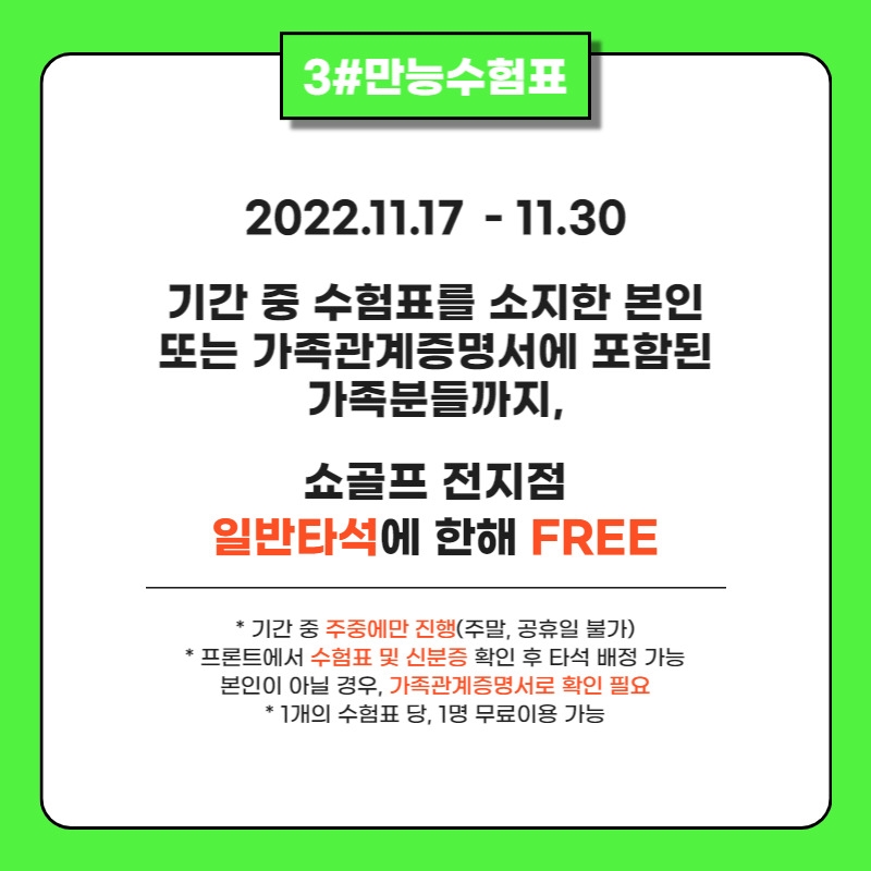 '온 가족이 즐기는 골프 놀이터'를 표방하는 쇼골프는 17일부터 30일까지 수험표를 제시하면 전 지점에서 타석을 무료로 사용할 수 있도록 했다.