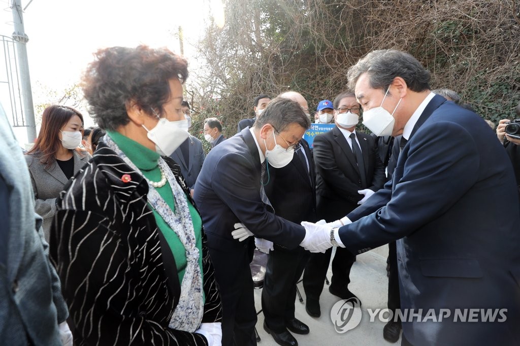 | ▲ 여순사건 유족 만난 이낙연 (여수=연합뉴스) 형민우 기자 = 더불어민주당 이낙연 상임선대위원장이 18일 오전 전남 여수시 만흥동 여순사건 희생자 위령비를 찾아 참배한 뒤 유족들과 인사하고 있다. 2021.3.18 minu21@yna.co.kr |