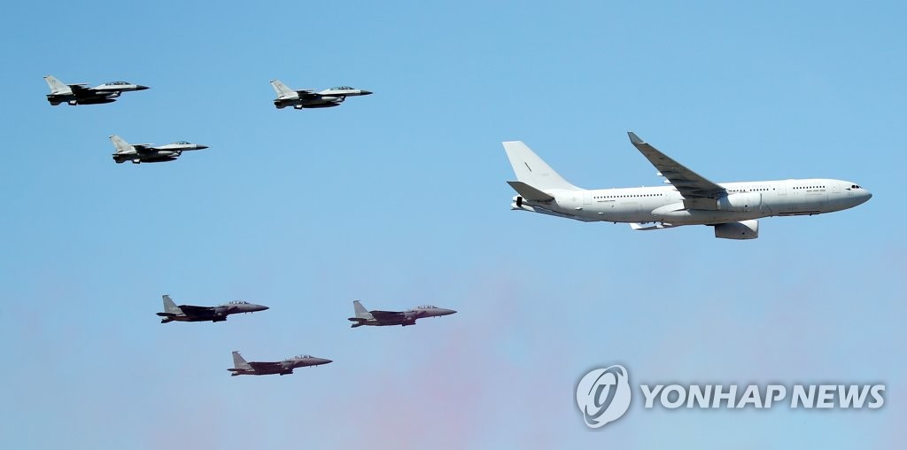 | ▲ A KC-330 military tanker transport (R), flies over the Seoul Air Base located just south of Seoul on Oct 18, 2021, along with F-15K and KF-16 jets, ahead of the official opening of the Seoul International Aerospace & Defense Exhibition (ADEX). (Yonhap) |