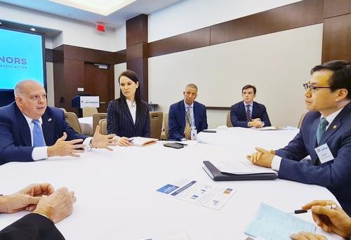 | ▲ This file photo, provided by South Korea's industry ministry on Jan. 30, 2022, shows Trade Minister Yeo Han-koo (R) listening to Larry Hogan (L), governor of Maryland, as they hold a meeting on steel tariffs and other issues of mutual concern. (PHOTO NOT FOR SALE) (Yonhap) |
