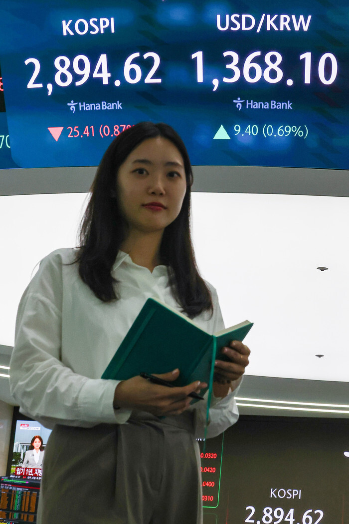 A financial data screen at the dealing room of Hana Bank in Seoul on June 13, 2025, shows the benchmark Korea Composite Stock Price Index having fallen 25.41 points, or 0.87 percent, to close at 2,894.62. South Korean stocks closed lower as rising tensions in the Middle East heightened investors' risk-off sentiment. (Yonhap)