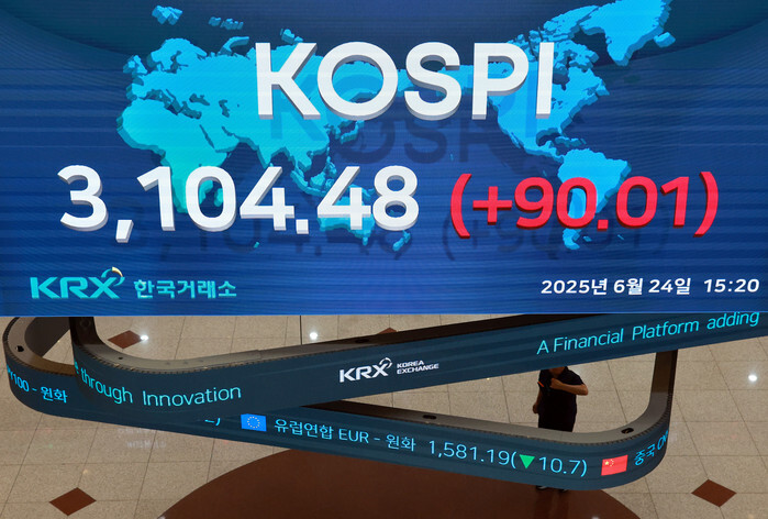 A financial data screen at the Korea Exchange in Seoul on June 24, 2025, shows the benchmark Korea Composite Stock Price Index having soared 90.01 points to close at 3,104.48. South Korean stocks sharply rebounded to an almost four-year high over eased tensions in the Middle East after U.S. President Donald Trump announced that Israel and Iran have agreed on a ceasefire to end their conflict. (Yonhap)