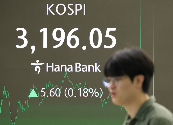 A financial data screen at the Korea Exchange in Seoul on July 25, 2025, shows the benchmark Korea Composite Stock Price Index having risen 5.60 points, or 0.18 percent, to close at 3,196.05. Seoul shares closed slightly higher, as investors kept close eyes on the ongoing tariff negotiations between South Korea and the United States, which are expected to have a huge impact on the economy. (Yonhap)