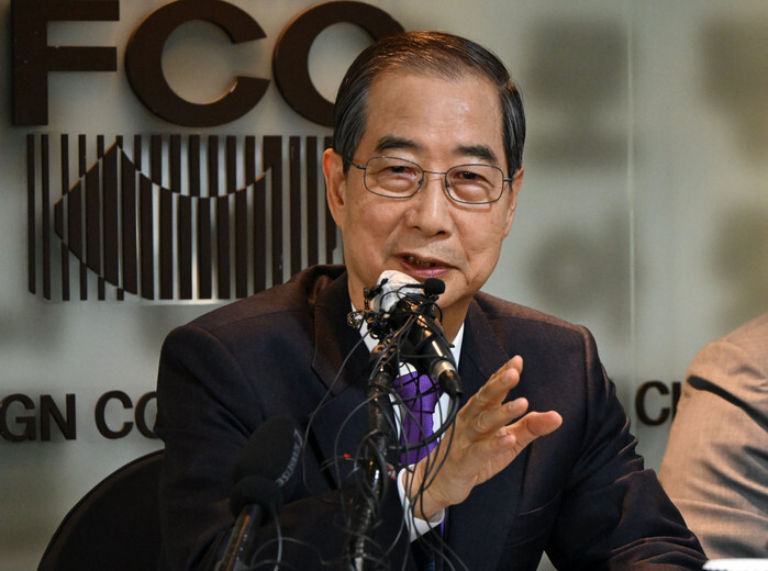 Former Prime Minister Han Duck-soo, an independent preliminary presidential candidate, speaks during a press conference with foreign journalists at the Press Center in Seoul on May 7, 2025. (Pool photo) (Yonhap)