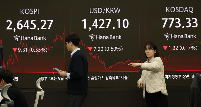 A financial data screen in the dealing room of Hana Bank in Seoul on Feb. 24, 2025, shows the benchmark Korea Composite Stock Price Index having fallen 9.31 points, or 0.35 percent, to close at 2,654.27. Seoul shares ended lower on tech losses, with investors remaining concerned over the impact of U.S. tariffs on major industries. (Yonhap)