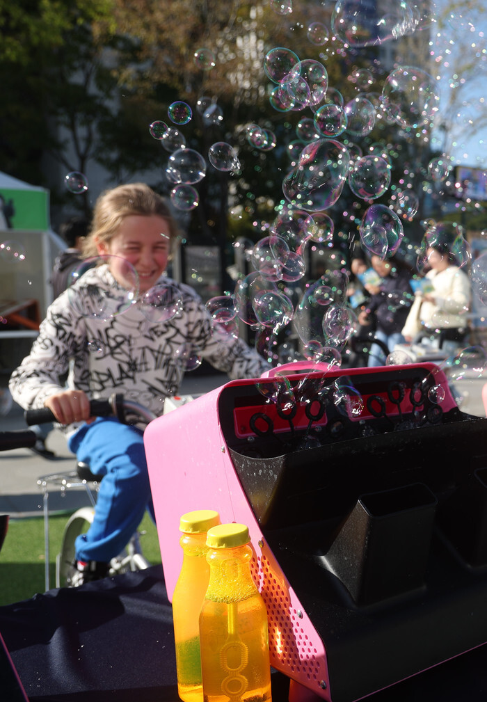 A child makes soap bubbles by pedaling a bicycle to produce electricity during an environment education festival in Seoul on Oct. 27, 2025. (Yonhap)