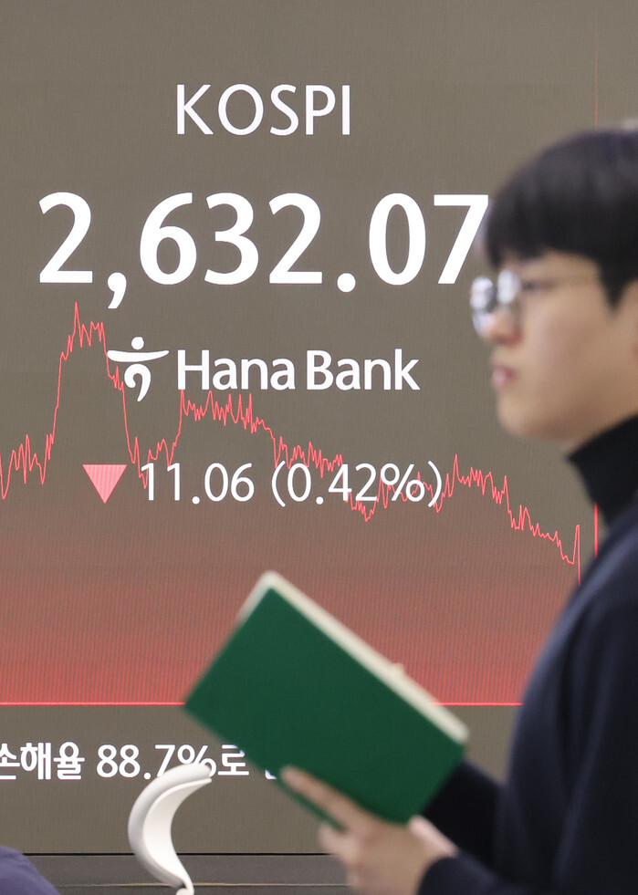 A financial data screen in the dealing room of Hana Bank in Seoul on March 24, 2025, shows the benchmark Korea Composite Stock Price Index having fallen 11.06 points, or 0.42 percent, to close at 2,632.07. Seoul shares ended lower as investors offloaded tech and other large-cap stocks on profit taking. (Yonhap)