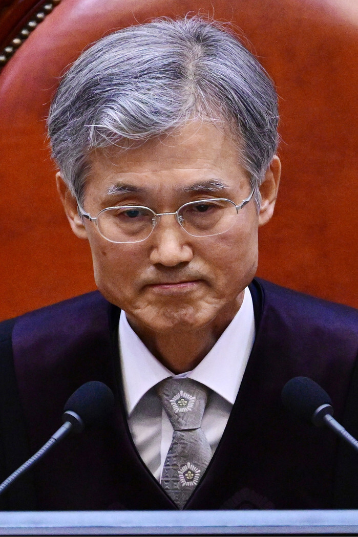 Supreme Court Chief Justice Cho Hee-dae looks stern in the courtroom in Seoul on May 1, 2025, as he attends a hearing to hand down a ruling on the election law violation case of the Democratic Party presidential candidate Lee Jae-myung. The court ordered the high court to reexamine Lee's acquittal on charges of election law violation. (Pool photo) (Yonhap)
