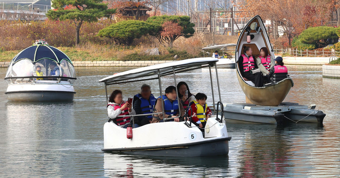 Visitors to Songdo Central Park in Yeonsu, Incheon, enjoy Sunday by riding leisure boats in warm weather on Nov. 30, 2025. (Yonhap)
