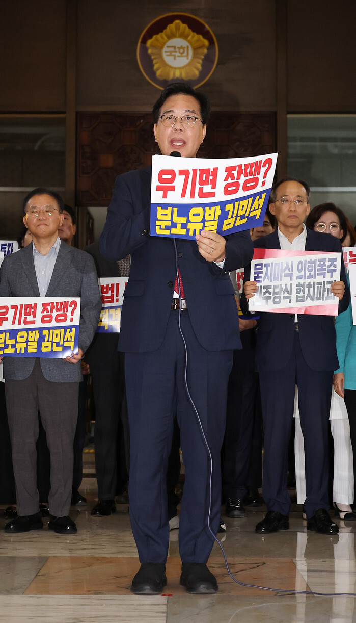 Song Eon-seog (C), interim leader of the main opposition People Power Party, speaks during a rally at the National Assembly in Seoul on July 3, 2025, to condemn the ruling Democratic Party for endorsing a confirmation motion for Prime Minister nominee Kim Min-seok amid objections from the opposition party over allegations surrounding his wealth and family. (Yonhap)