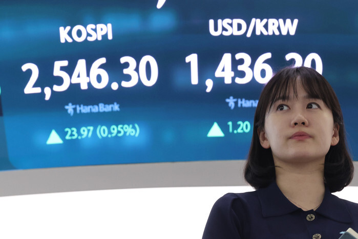 A financial data screen in the dealing room of Hana Bank in Seoul on April 25, 2025, shows the benchmark Korea Composite Stock Price Index having gained 23.97 points, or 0.95 percent, to close at 2,546.30. South Korean stocks closed higher, as investors assessed the outcome of the first round of tariff talks between Seoul and Washington. (Yonhap)