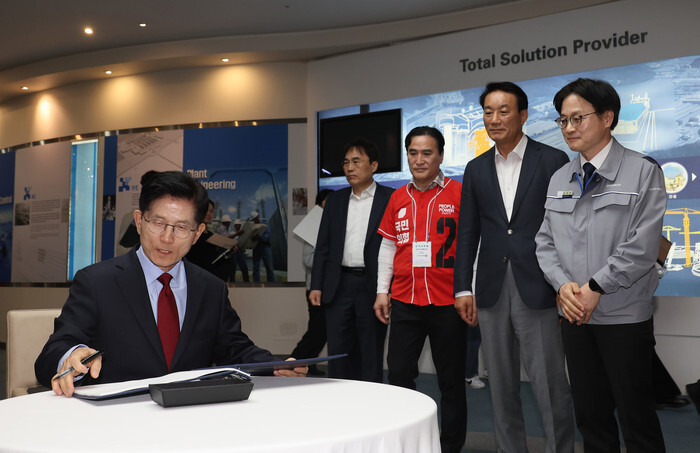 Kim Moon-soo, the presidential candidate of the conservative People Power Party, signs a guest book during a visit to Doosan Enerbility Co., a major plant constructor, in Changwon, South Gyeongsang Province, southeastern South Korea, on May 14, 2025, ahead of the June 3 presidential election. (Yonhap)