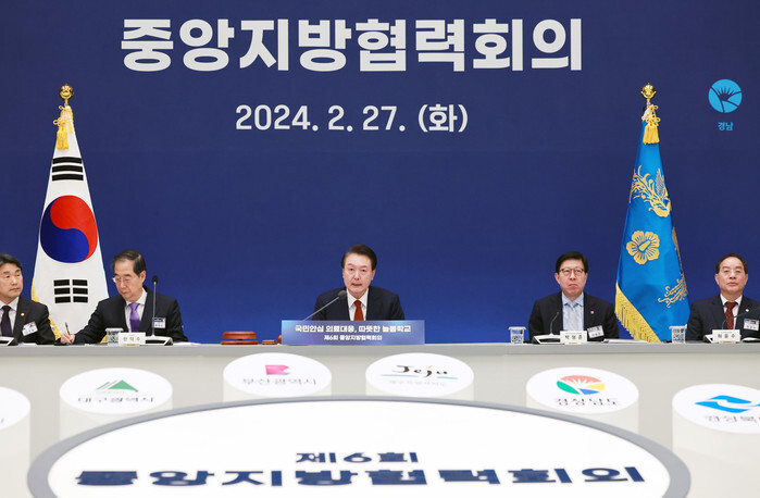 President Yoon Suk Yeol (C) speaks during a meeting to bolster cooperation between central and local governments at the guesthouse of the former presidential office, Cheong Wa Dae, in Seoul on Feb. 27, 2024. (Yonhap)