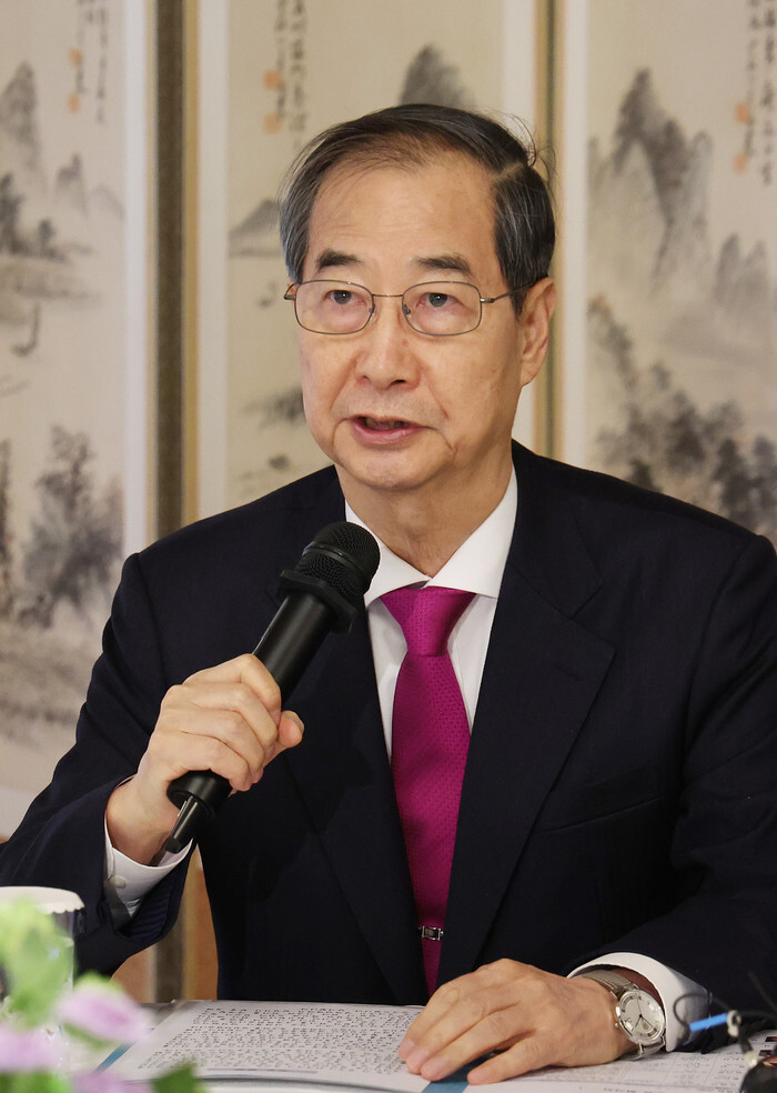 Acting President Han Duck-soo, who concurrently serves as prime minister, speaks during his meeting with heads of the country's six industry bodies at his official residence in Seoul on March 27, 2025. (Pool photo) (Yonhap)