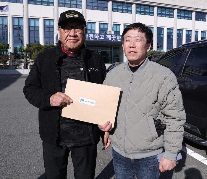 Choi Seong-ryong (L), head of a group representing families of individuals abducted by North Korea, and Park Sang-hak, a North Korean defector and leader of Fighters for Free North Korea, outline their plan to launch balloons carrying anti-North Korea leaflets toward the North at the Sokcho Maritime Police Station in Sokcho, 213 kilometers east of Seoul, on Nov. 19, 2024. (Yonhap)