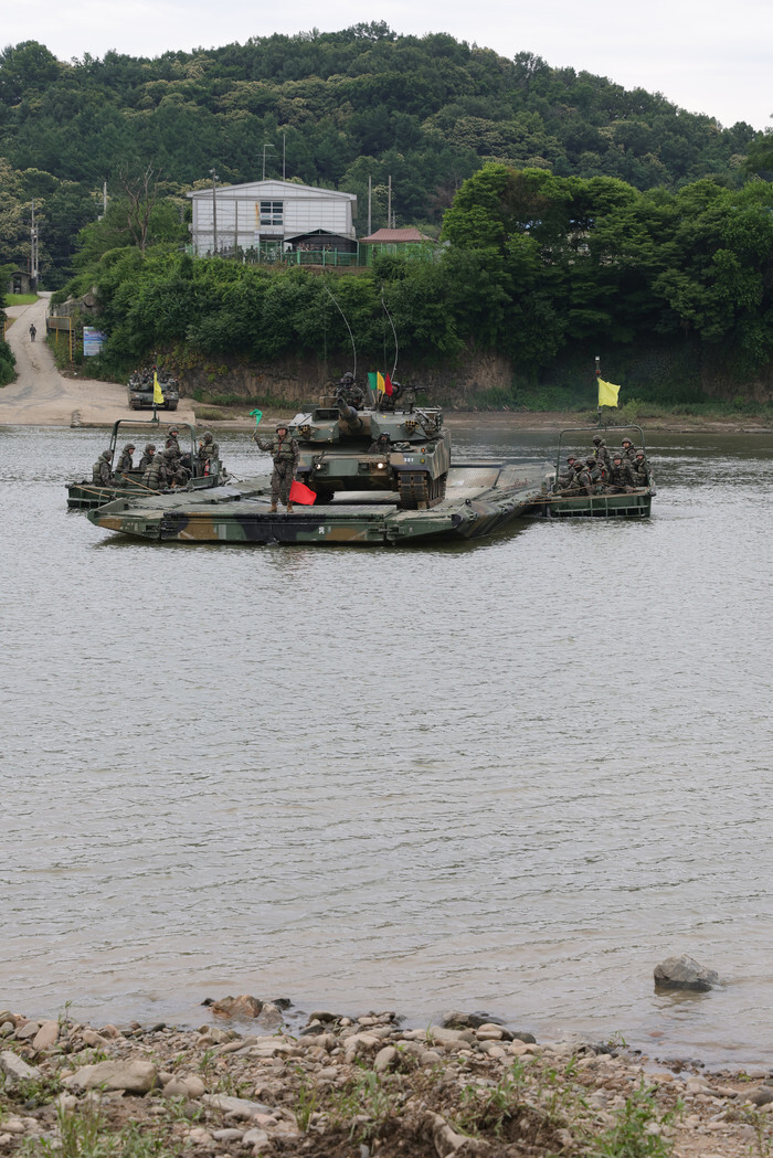 A K1A2 tank crosses the Imjin River using a pontoon bridge in Paju, north of Seoul, on June 24, 2025, as the South Korean Army's 2nd Mechanized Brigade and other military units conduct a river-crossing drill. (Yonhap)