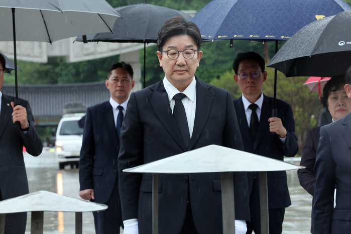 Kweon Seong-dong, floor leader of the conservative People Power Party, offers a silent prayer to pay tribute to slain pro-democracy fighters at a national cemetery in the southwestern city of Gwangju on May 16, 2025, two days ahead of the 45th anniversary of a pro-democracy uprising. The Gwangju May 18 National Cemetery honors hundreds of citizens who were killed in the city during protests against the military junta of Chun Doo-hwan in May 1980. (Yonhap)