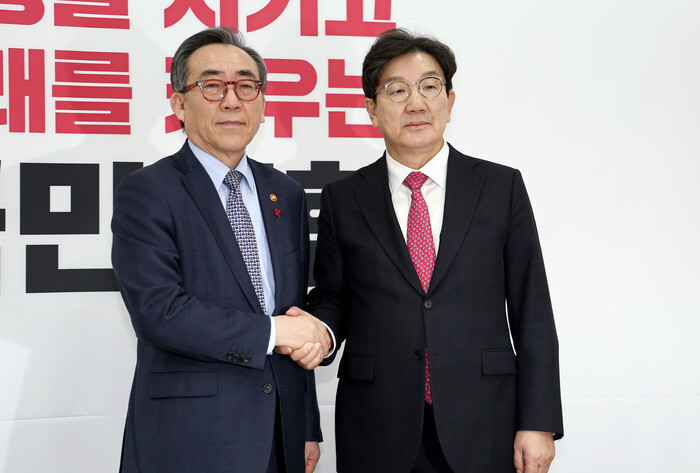 Rep. Kweon Seong-dong (R), acting head of the ruling People Power Party, poses with Foreign Minister Cho Tae-yul during their meeting at the National Assembly in Seoul on Dec. 17, 2024. (Yonhap)