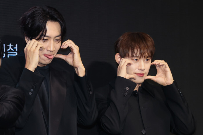 South Korean actors Kim Sung-chul (R) and Lee Kwang-soo, who star in the new Disney+ original series "No Way Out: The Roulette," pose for a photo during a publicity event in Seoul on July 24, 2024. The first episode of the series will be available on July 31. (Yonhap)