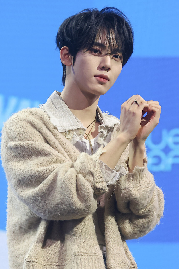 Han Yoo-jin, a member of South Korean boy group Zerobaseone, poses for a photo during a showcase for the group's mini album "Blue Paradise" in Seoul on Feb. 24, 2025. (Yonhap)