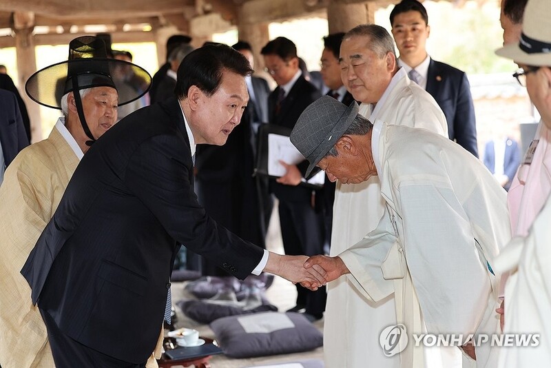 (서울=연합뉴스) 곽민서 기자 = 윤석열 대통령은 27일 경북 안동 병산서원을 방문해 지역 유림을 만났다고 대통령실이 전했다.