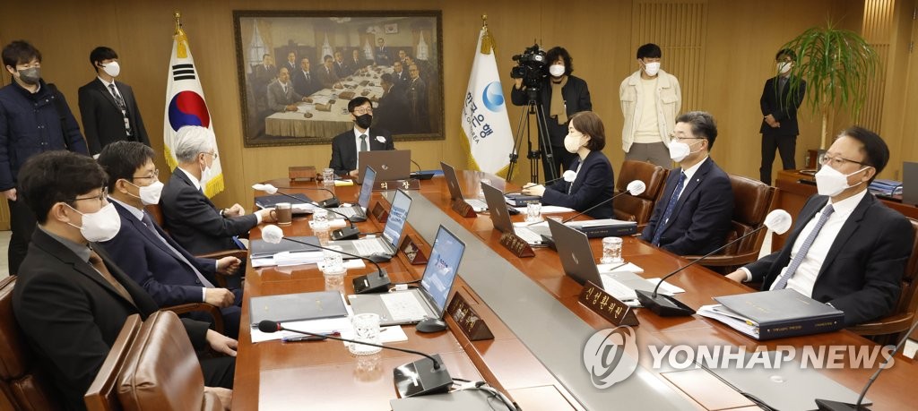 | ▲ Bank of Korea (BOK) Gov. Rhee Chang-yong (C, rear) presides over a Monetary Policy Committee meeting at the central bank in Seoul on Jan. 13, 2023. The central bank raised its policy rate by a quarter percentage point to 3.5 percent as it focuses on tackling persistently high inflation despite mounting worries over an economic slowdown. (Pool photo) (Yonhap) |