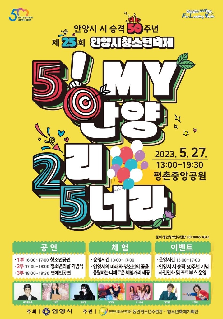 (안양=연합뉴스) 경기 안양시는 오는 27일 평촌중앙공원에서 제25회 안양시 청소년 축제 '5! my 안양 2리 5너라'를 연다고 23일 밝혔다.
