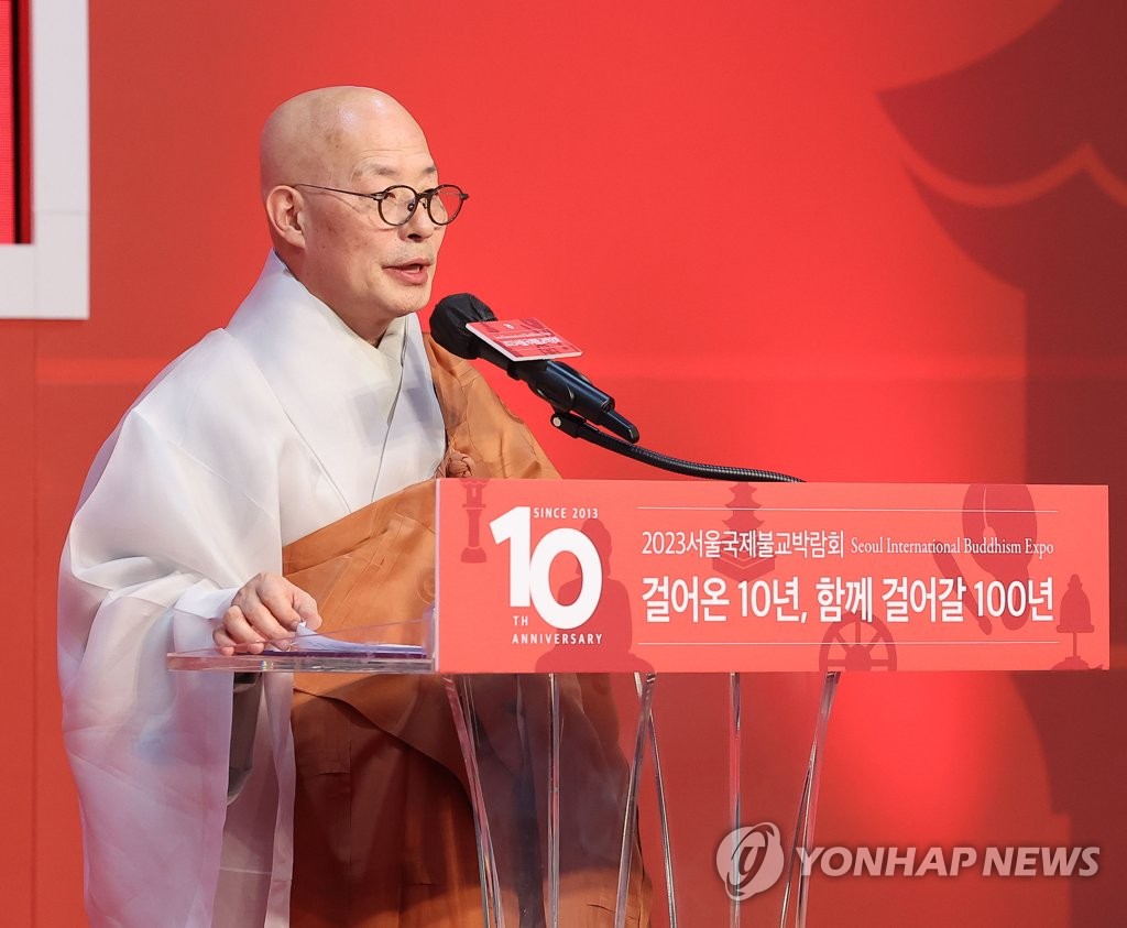 | ▲ 불교 박람회 개회사하는 진우 스님 (서울=연합뉴스) 류영석 기자 = 대한불교조계종 총무원장 진우 스님이 30일 오후 서울 강남구 SETEC에서 열린 2023 서울국제불교박람회 개회식에서 개회사를 하고 있다. 2023.3.30 ondol@yna.co.kr |