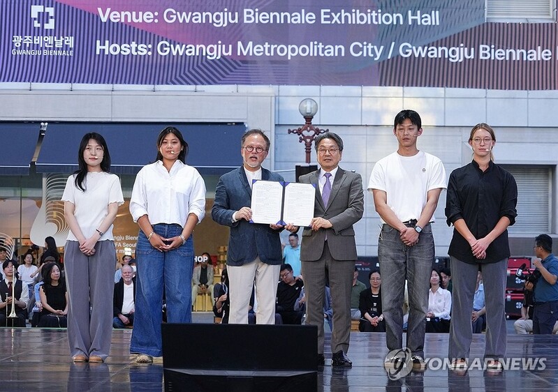 | ▲ 광주 포용디자인 매니페스토 선언 (광주=연합뉴스) 29일 오후 광주 북구 광주비엔날레 광장 특설무대에서 열린 2025 광주디자인비엔날레 개막식에서 강기정 광주시장과 국내외 학생들이 '광주 포용디자인 매니페스토 선언'을 마친 뒤 기념 촬영을 하고 있다. 2025.8.29 [광주시 제공. 재판매 및 DB 금지] hs@yna.co.kr |
