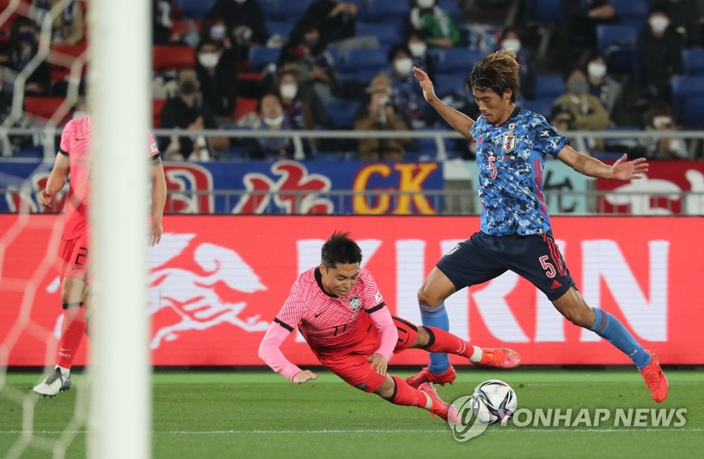 | ▲ Lee Dong-jun of South Korea (L) falls to the pitch after colliding with Hidemasa Morita of Japan during their friendly football match at Nissan Stadium in Yokohama, Japan, on March 25, 2021. (Yonhap) |