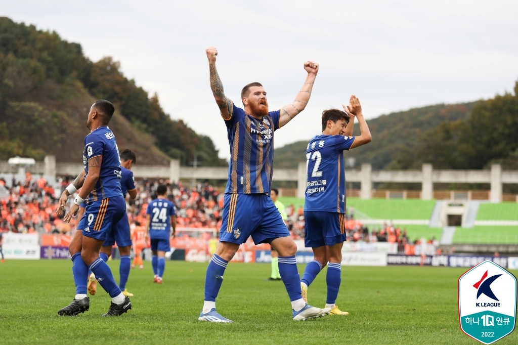 | ▲ Martin Adam of Ulsan Hyundai FC celebrates his goal against Gangwon FC during the clubs' K League 1 match at Songam Sports Town in Chuncheon, 75 kilometers northeast of Seoul, on Oct. 16, 2022, in this photo provided by the Korea Professional Football League. (PHOTO NOT FOR SALE) (Yonhap) |