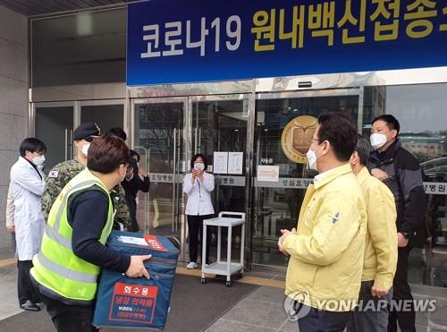 SEOUL, Feb. 25 (Yonhap) -- Trucks packed with the first of some 1.5 million doses of coronavirus vaccines were distributed across South Korea on Thursday as long-term care hospitals and public health centers rushed to prepare for the country's ambitious vaccination program.
