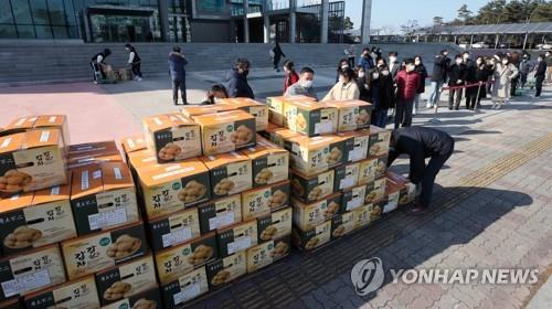 | ▲ (강릉=연합뉴스) 이해용 기자 = 가톨릭관동대가 8일 오후 교정에서 설 선물로 전 직원에게 감자를 한 상자(20㎏)씩 나눠주고 있다. 2021.2.8 |