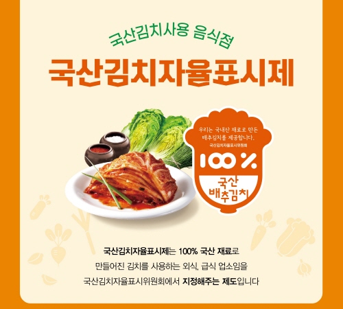 '국산 김치 자율 표시제'는 김치 생산업체에서 국산 재료를 100% 사용해 제조한 김치를 구매하거나 직접 제조·사용하는 음식점 등을 인증해주는 제도이다.