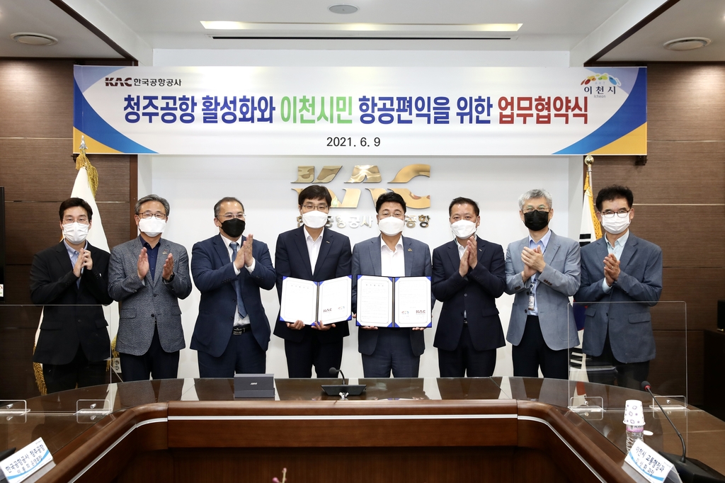 (이천=연합뉴스) 최찬흥 기자 = 경기 이천시는 9일 한국공항공사 청주공항과 '청주공항 활성화와 이천시민 항공편익을 위한 업무협약'을 맺었다.