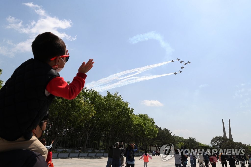 어린이날임에도 가족 단위 나들이객이 발길을 둘 만한 곳이 줄어든 이날 공군특수비행팀 블랙이글스가 천안 독립기념관 상공에서 어린이날 축하 비행을 펼쳐 어린이들의 아쉬움을 그나마 달랬다.