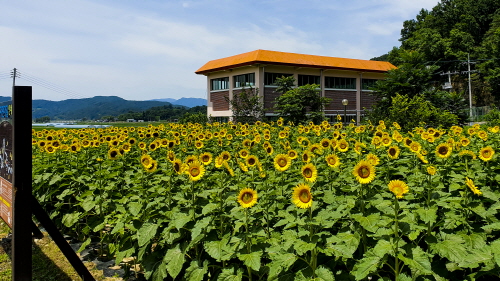 지난 5월에 해바라기 씨를 직파해 그간 잡초를 제거하고 정성껏 가꾸어 온 덕분에 해바라기가 폭염 속에서도 훌쩍 커서 초록빛 제방과 들판에 어우러져 도도한 모습으로 작열하는 태양을 하염없이 바라만 본다.