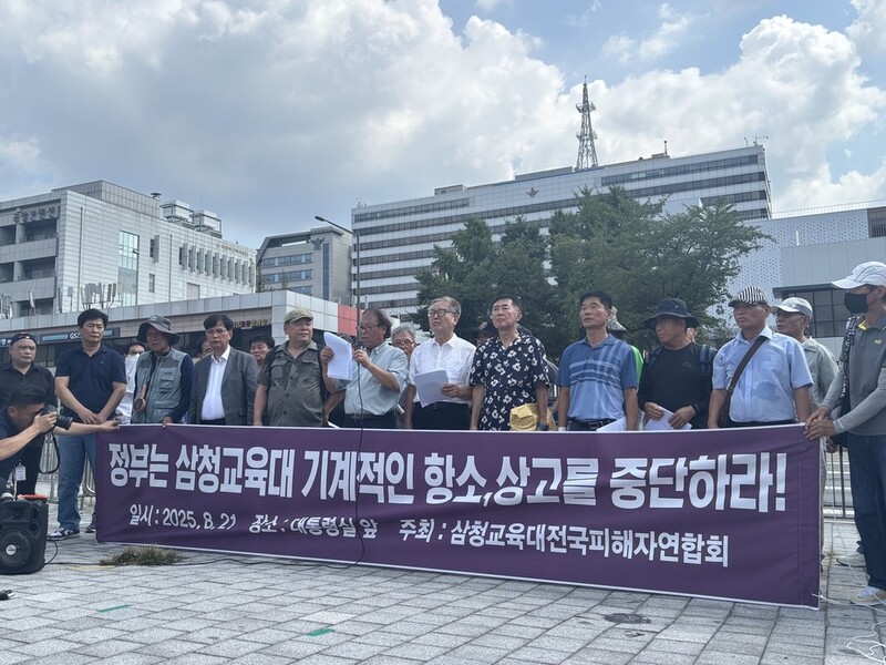 (서울=연합뉴스) 조현영 기자 = 삼청교육대 피해자들은 21일 용산 대통령실 앞에서 기자회견을 열고 피해자들의 국가 상대 소송에서 국방부가 상소를 일괄 취하해야 한다고 촉구했다.